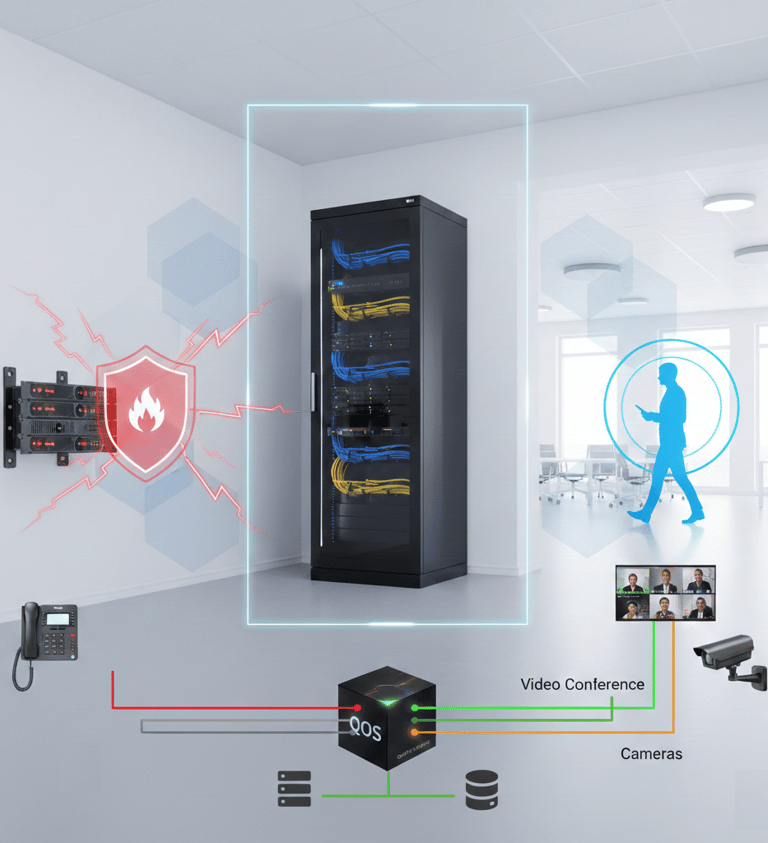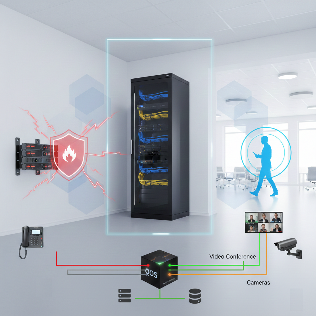 QOS : Fini les coupures lors des appels. Nous priorisons intelligemment les flux critiques (Téléphonie VoIP, Visioconférence, Caméras) pour qu'un gros téléchargement ne ralentisse jamais vos outils de travail.